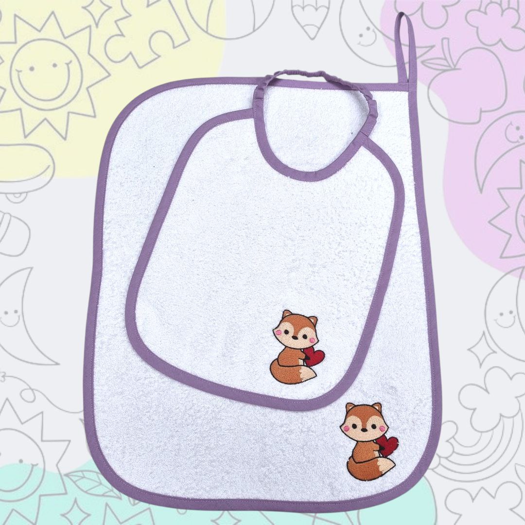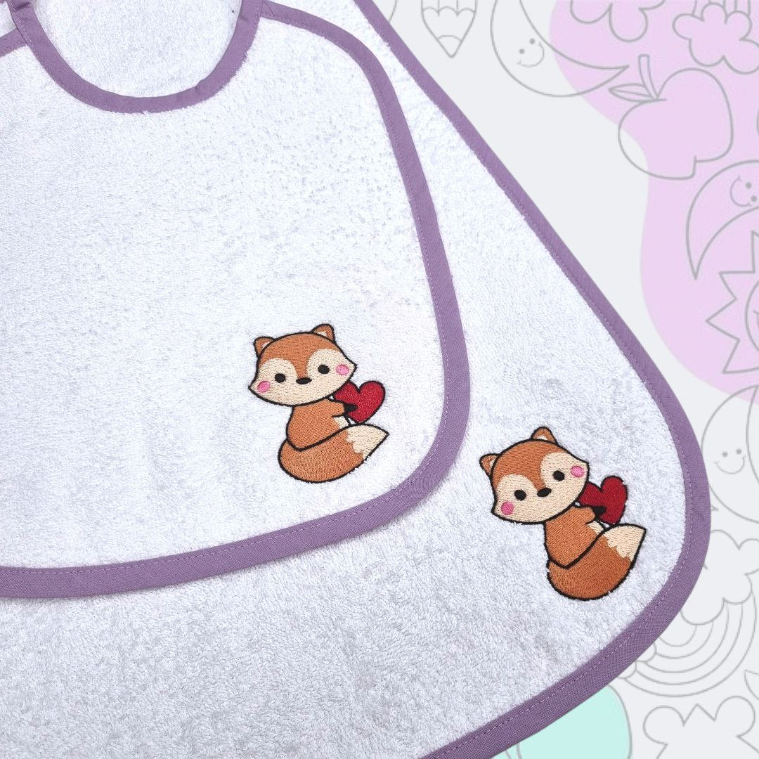Set asilo composto da bavaglino e asciugamano tagliati, confezionati e ricamati nel nostro laboratorio, in morbida spugna 100% cotone. Con ricamata una dolce volpe.