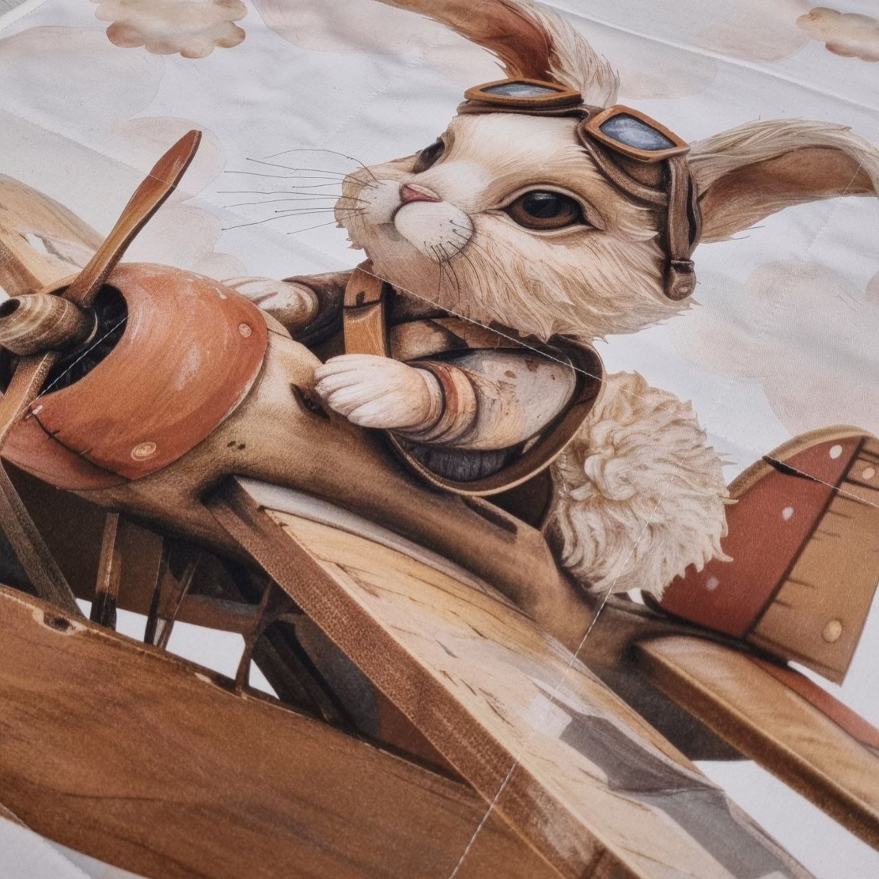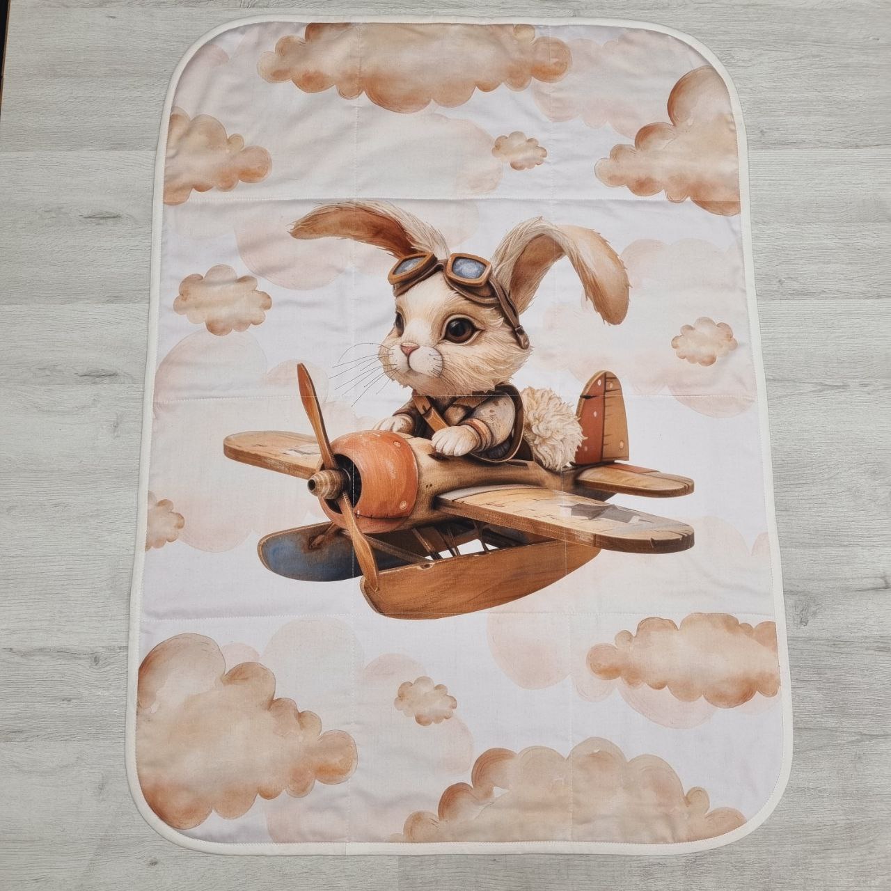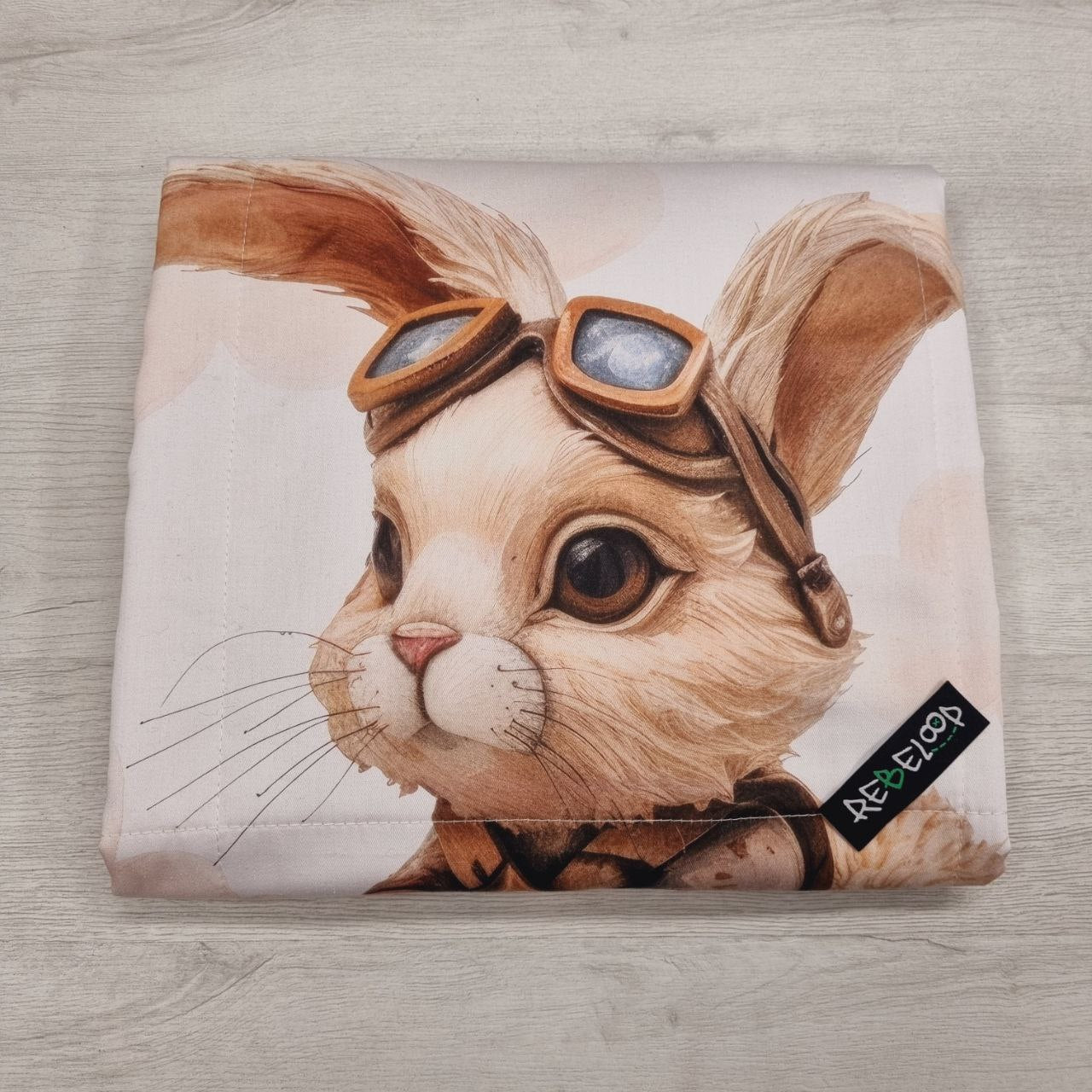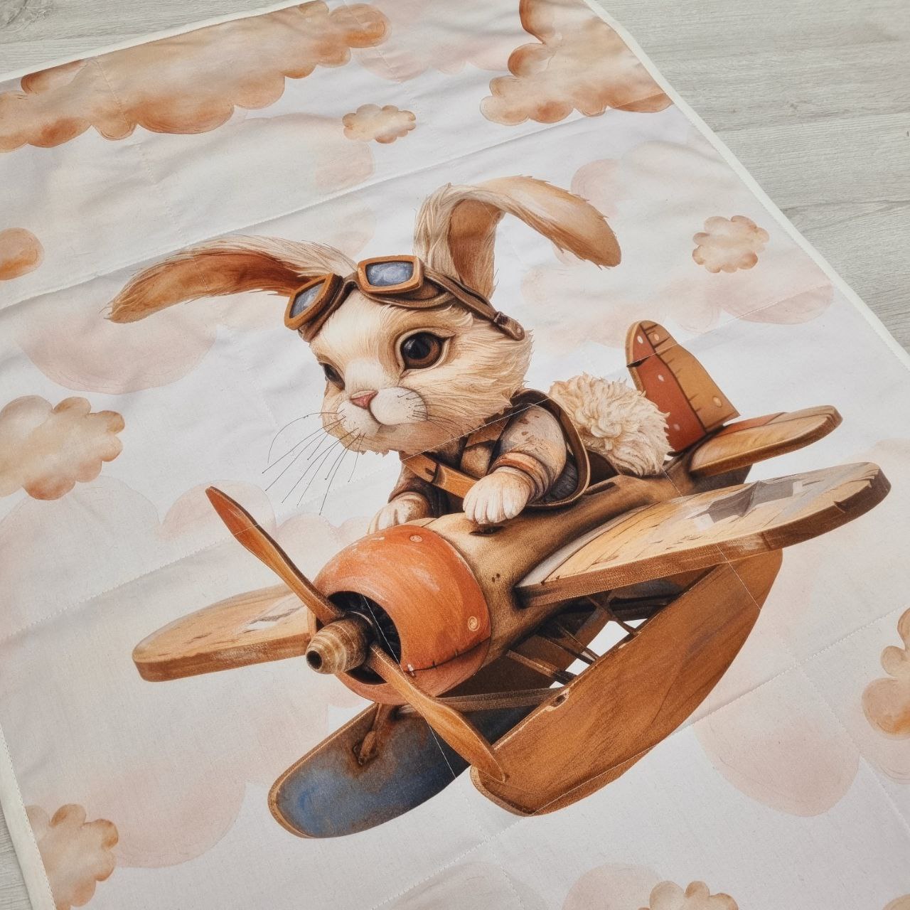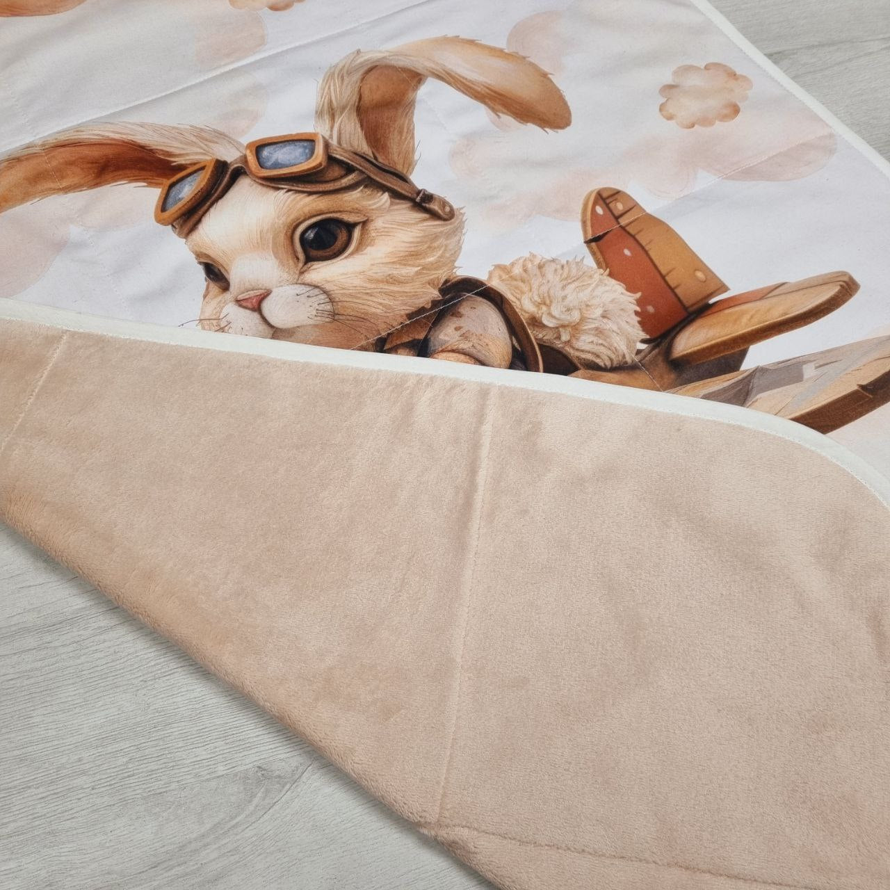 Trapuntino per culla con coniglietto aviatore, in cotone e morbido pile peluche. Misure ca. 100x75. Confezionato artigianalmente nel nostro laboratorio e personalizzabile con nome ricamato =)