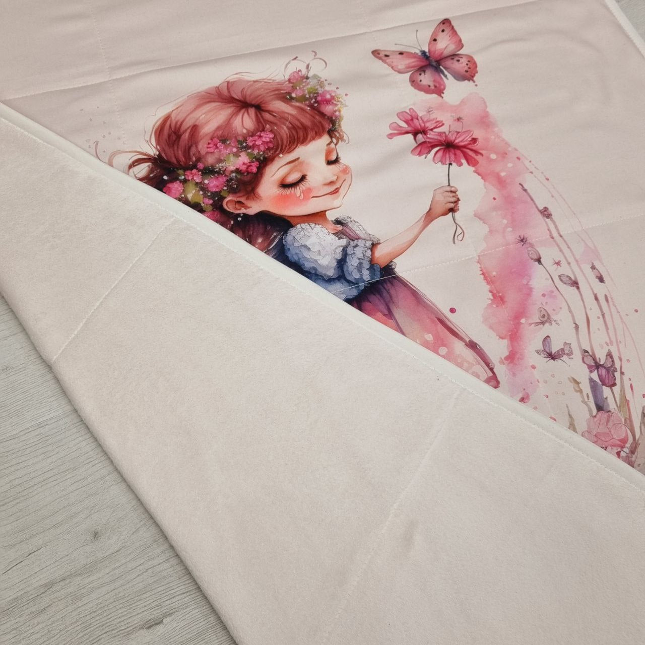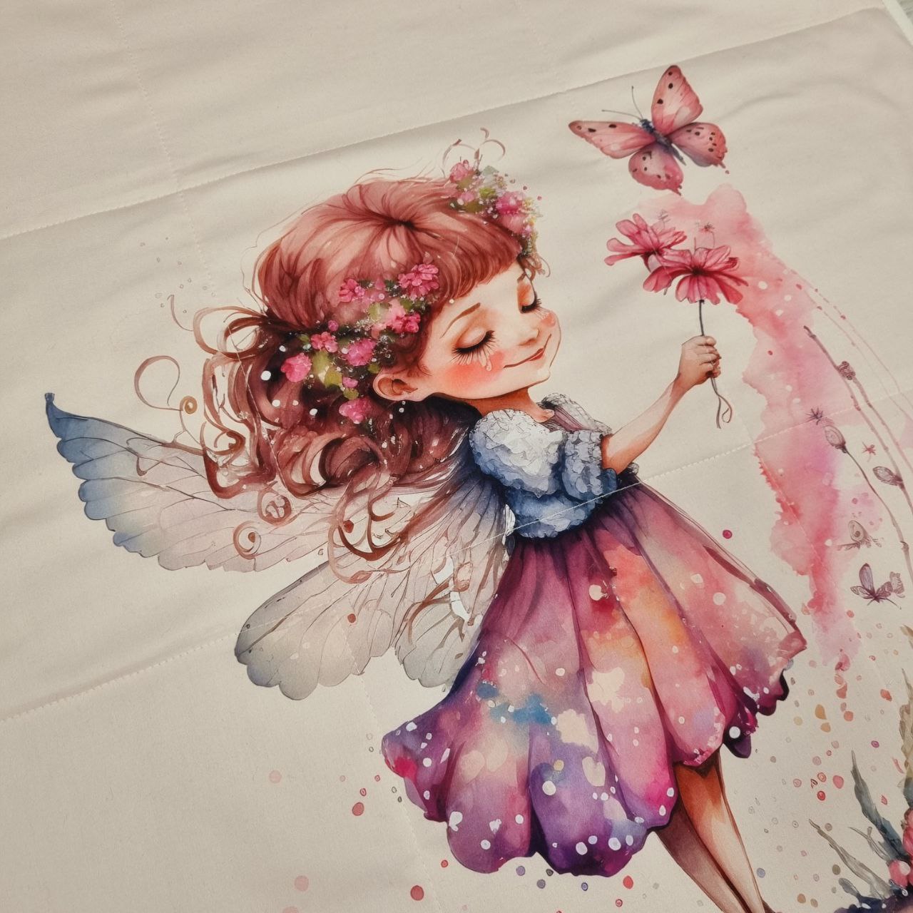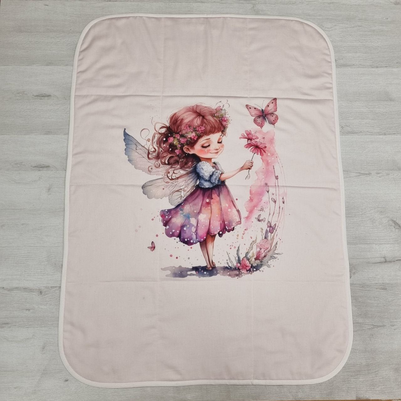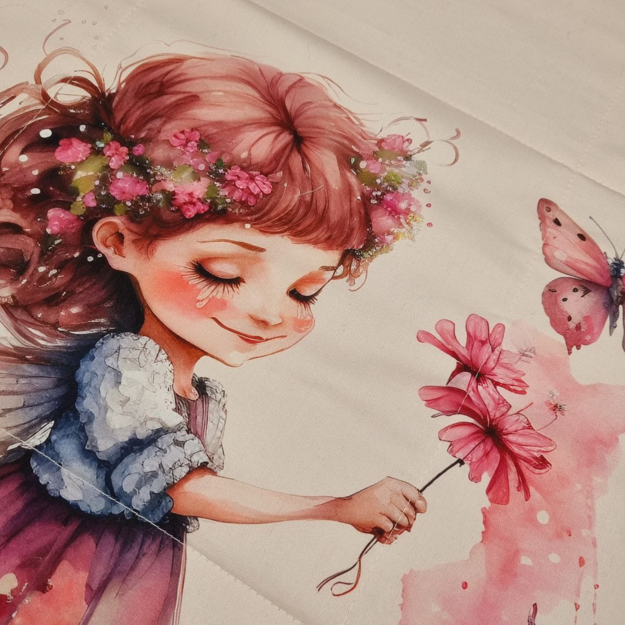 Trapuntino per culla con dolce fatina, in cotone e morbido pile peluche. Misure ca. 100x75. Confezionato artigianalmente nel nostro laboratorio e personalizzabile con nome ricamato =)