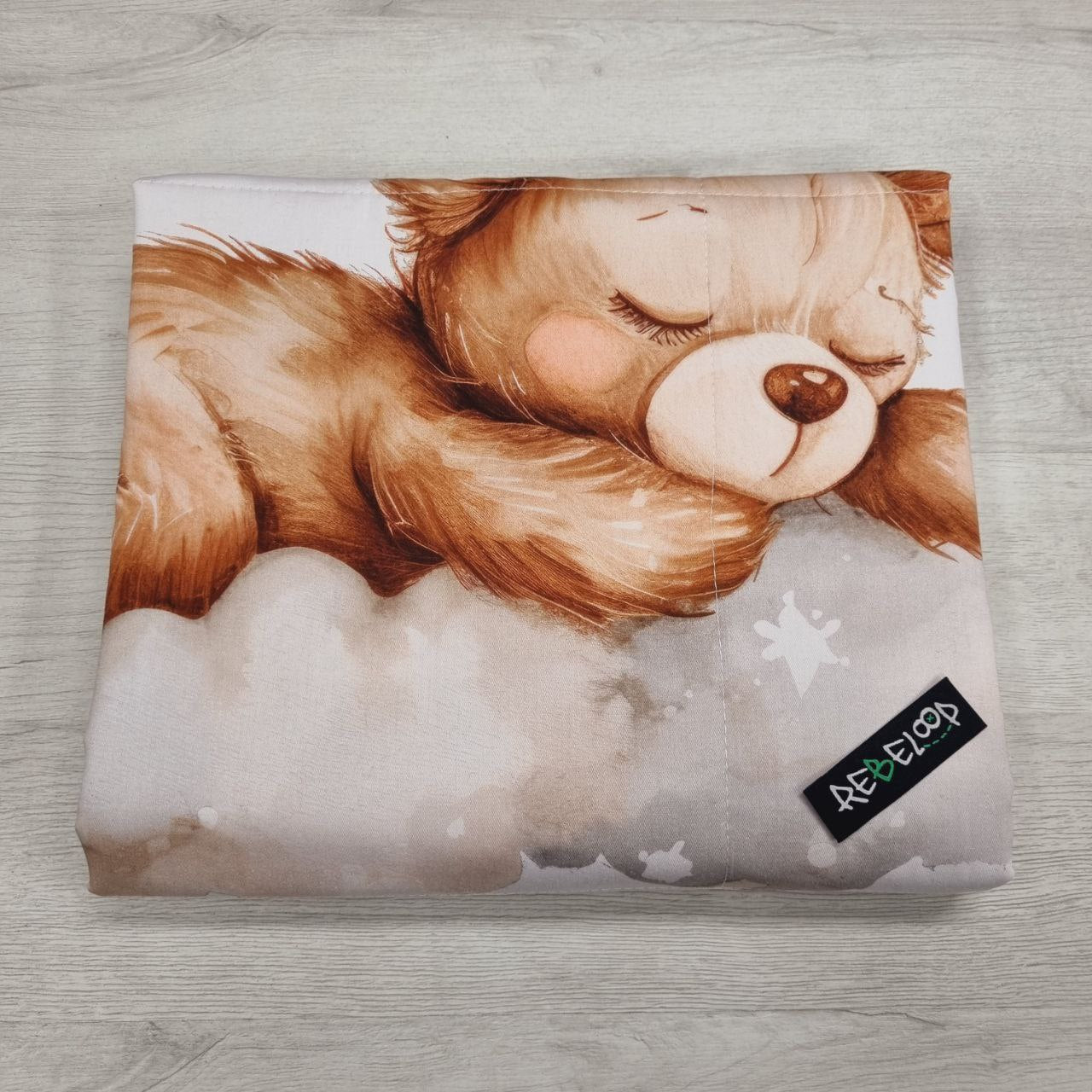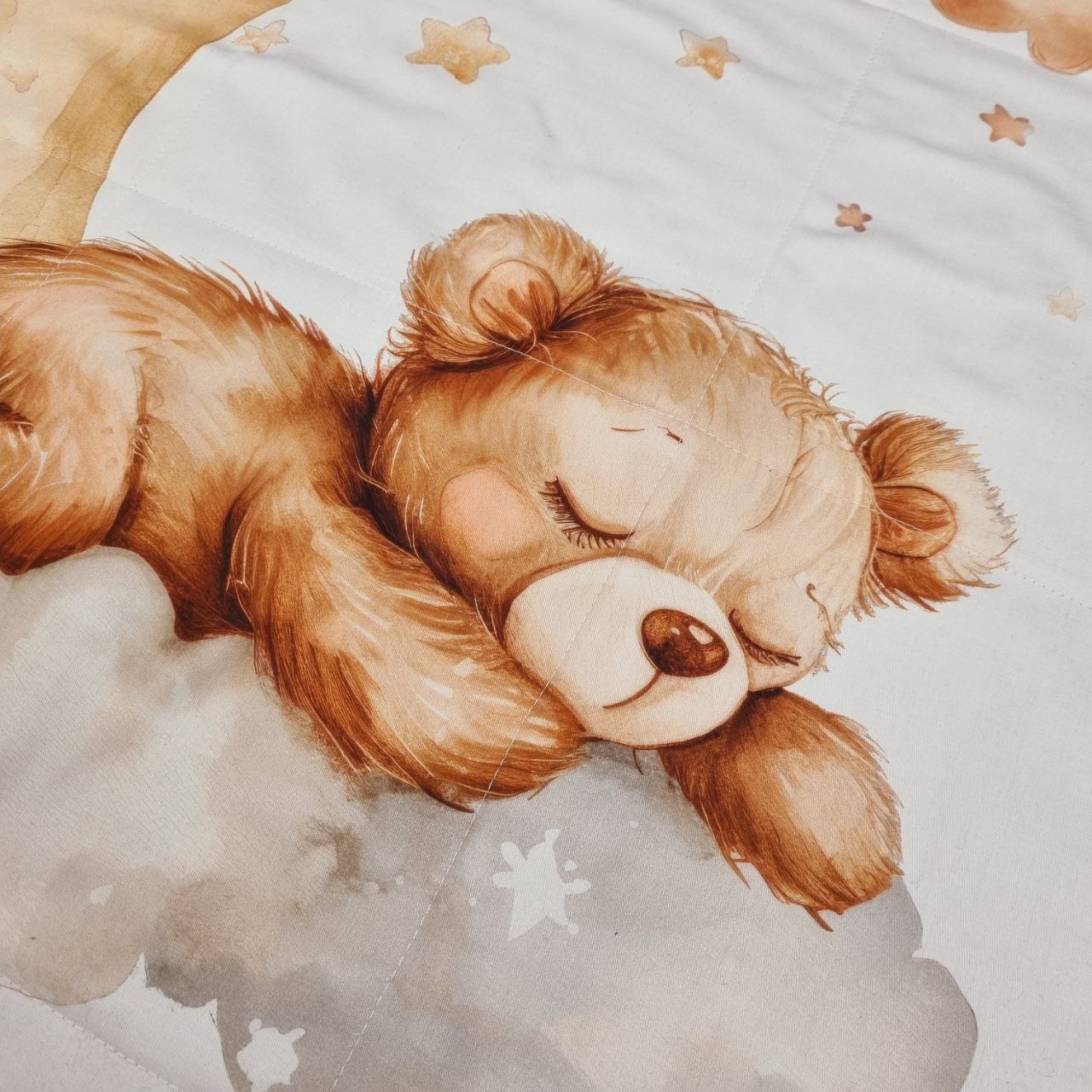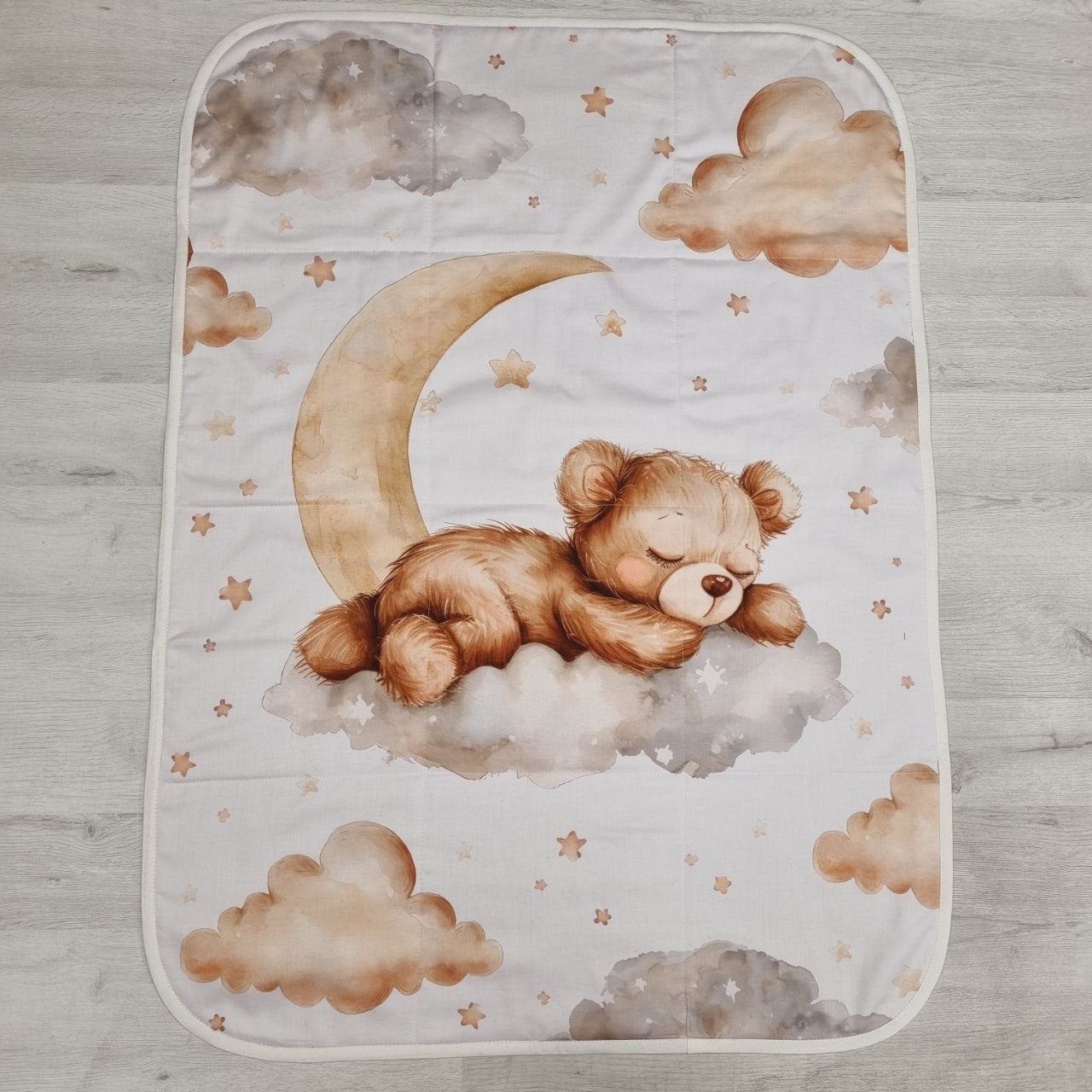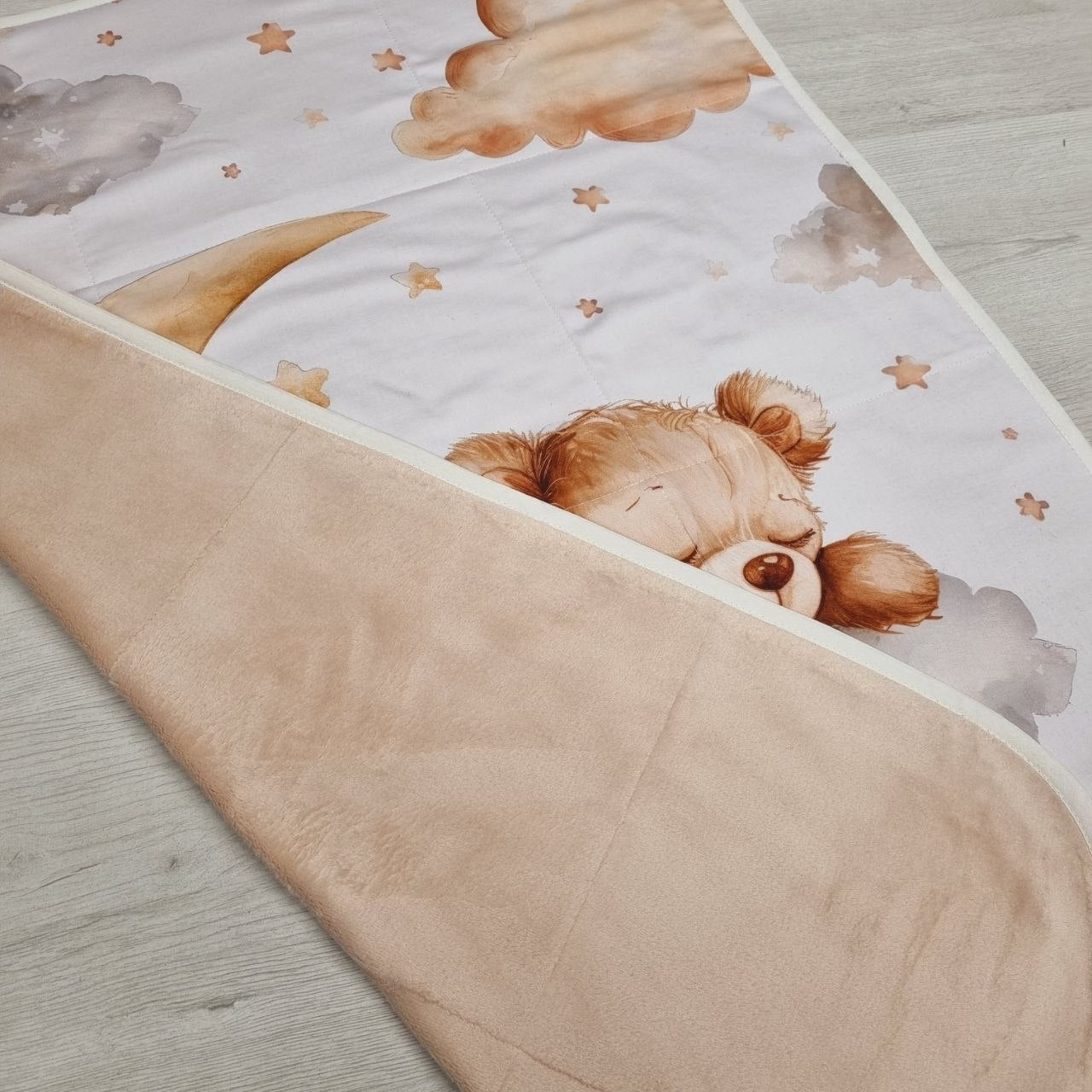 Trapuntino per culla con orsetto addormentato tra nuvole e stelle, in cotone e morbido pile peluche. Misure ca. 100x75. Confezionato artigianalmente nel nostro laboratorio e personalizzabile con nome ricamato =)