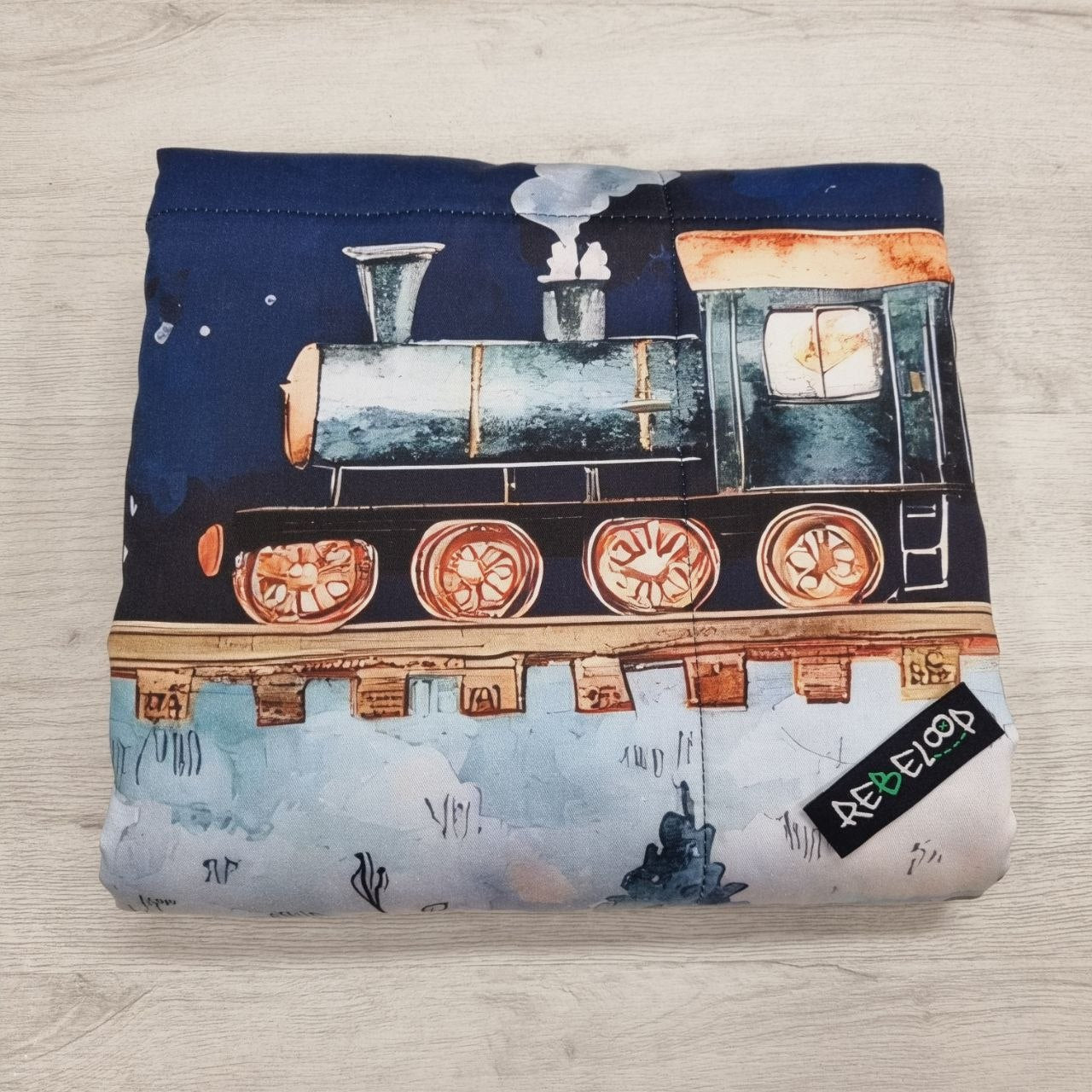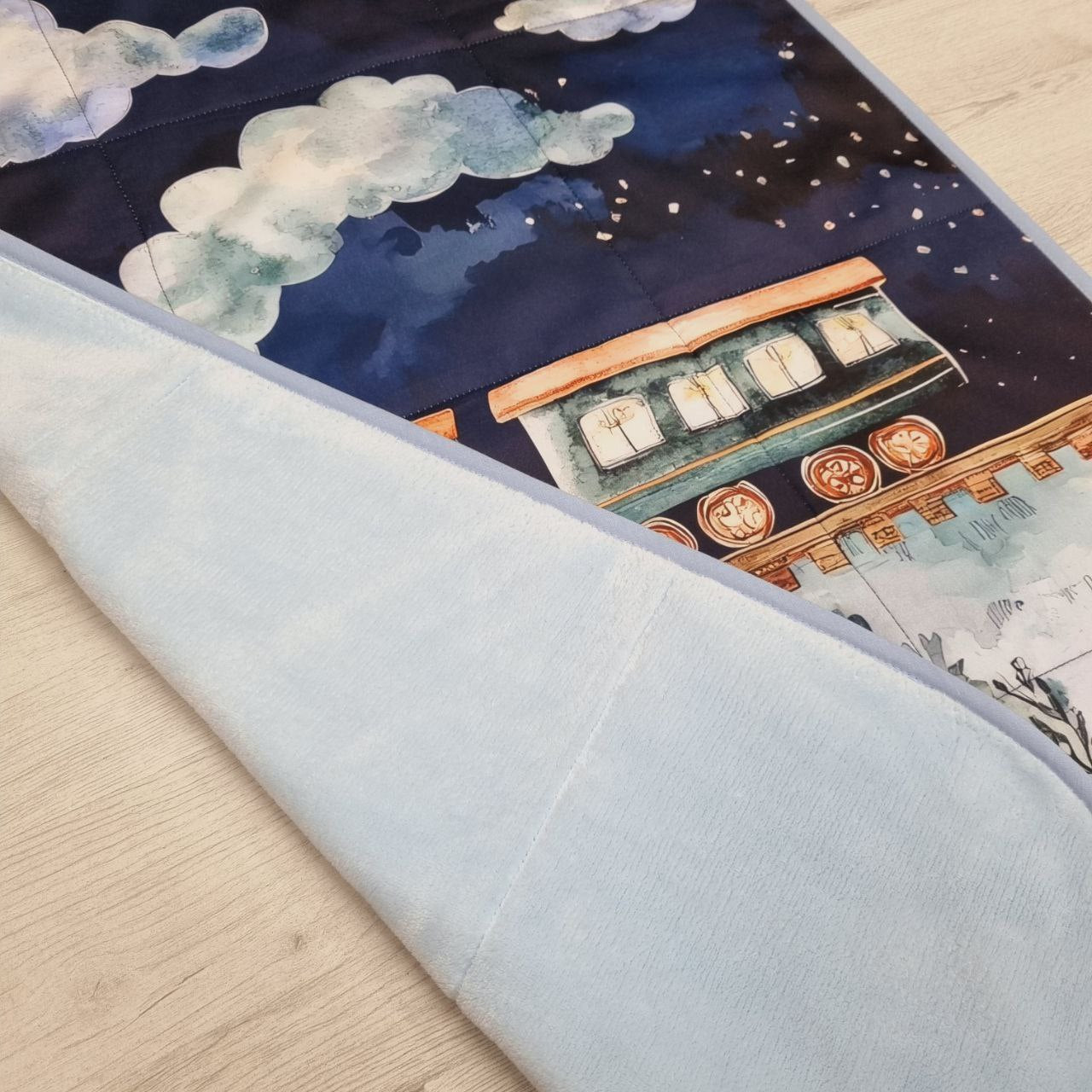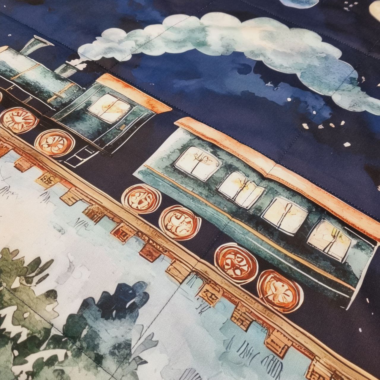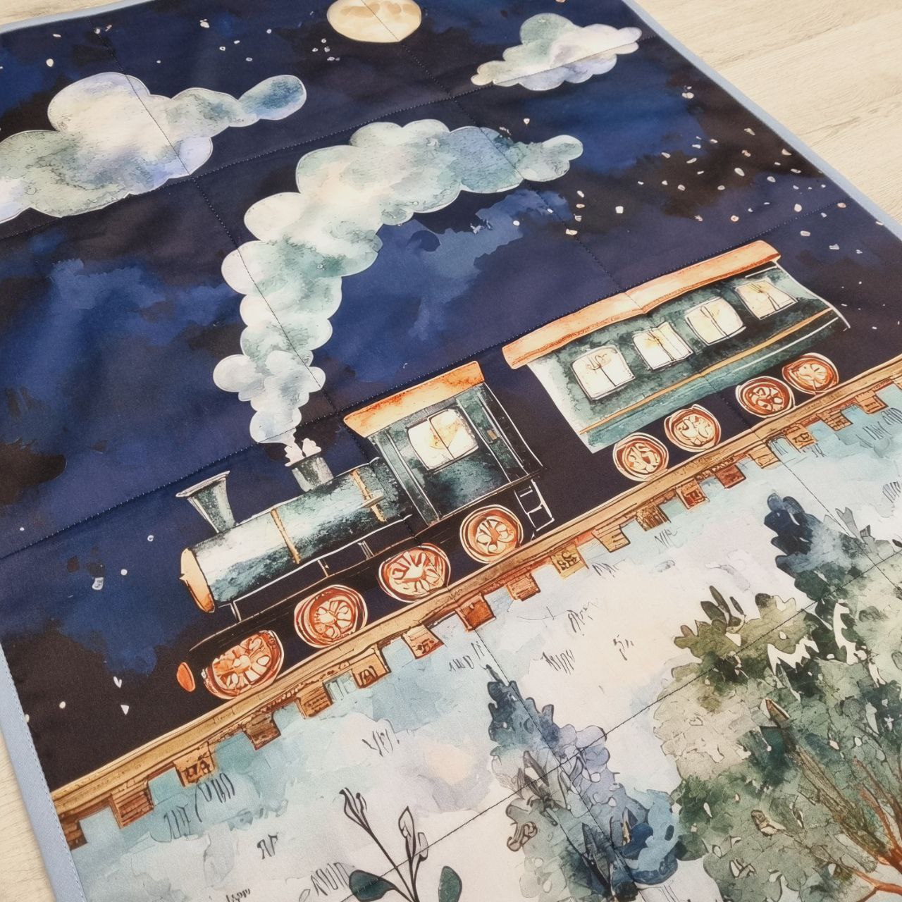 Trapuntino per culla con trenino magico, in cotone e morbido pile peluche. Misure ca. 100x75. Confezionato artigianalmente nel nostro laboratorio e personalizzabile con nome ricamato =)