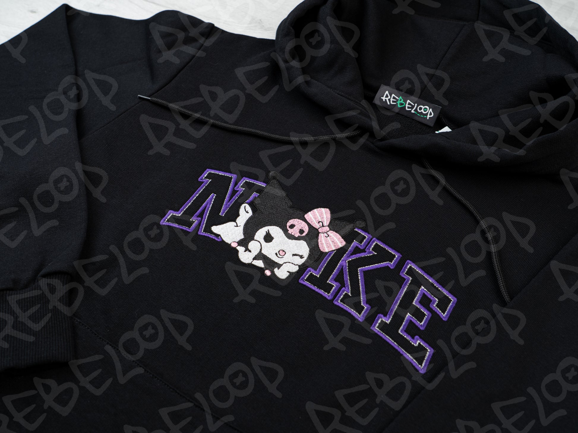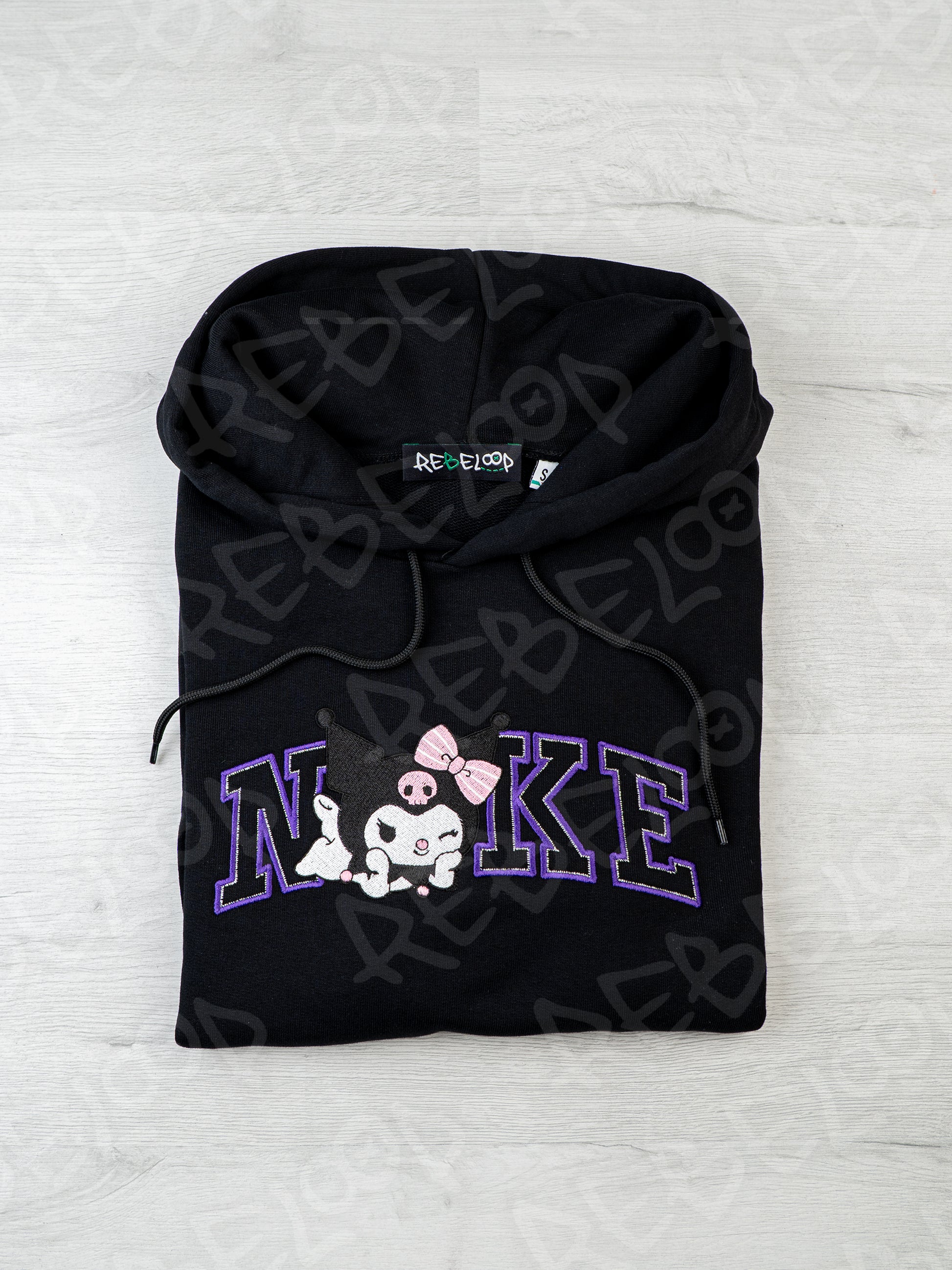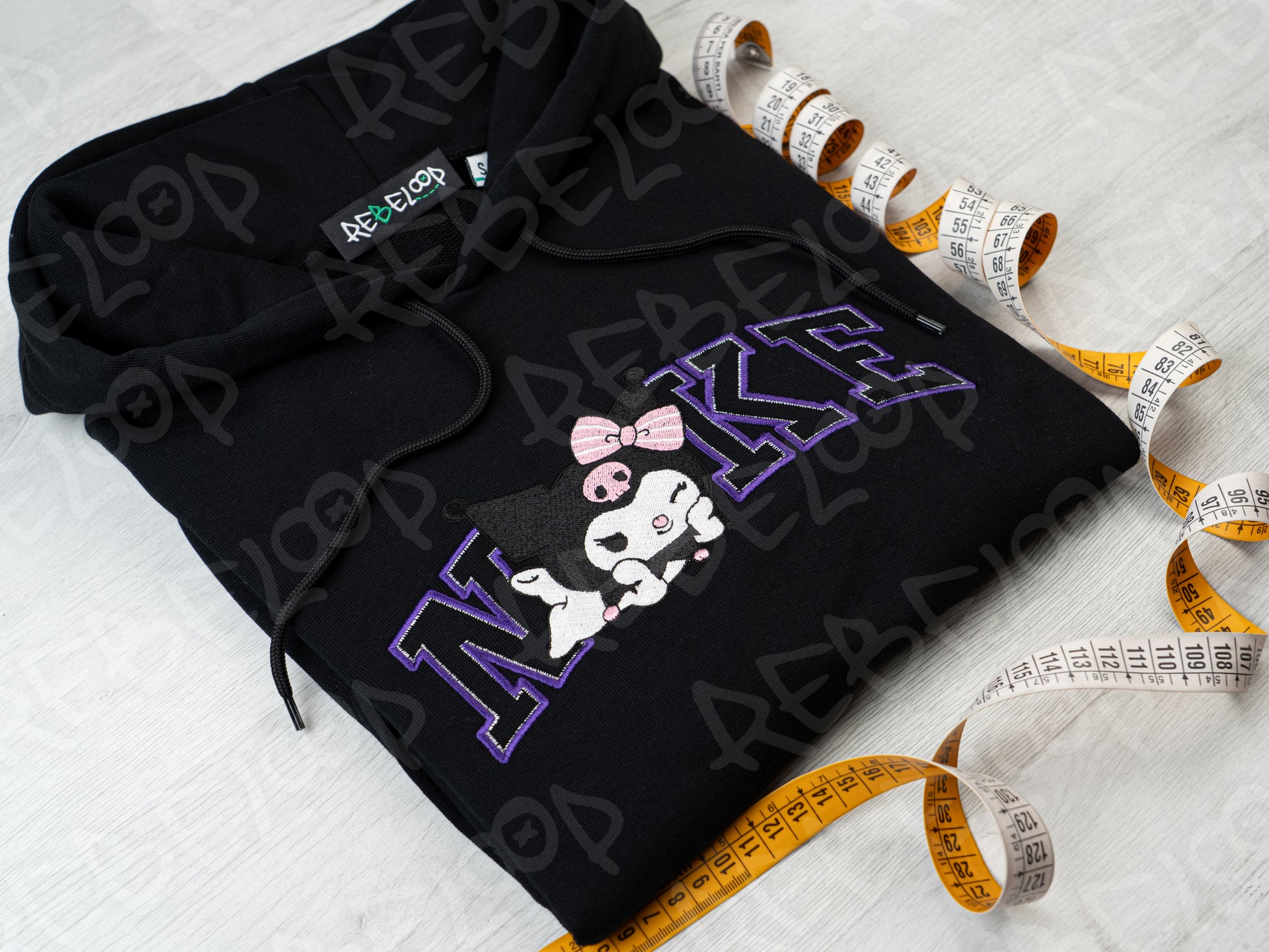 Felpa con ricamo ispirato a Kuromi, scritta realizzata con un punto cordoncino.