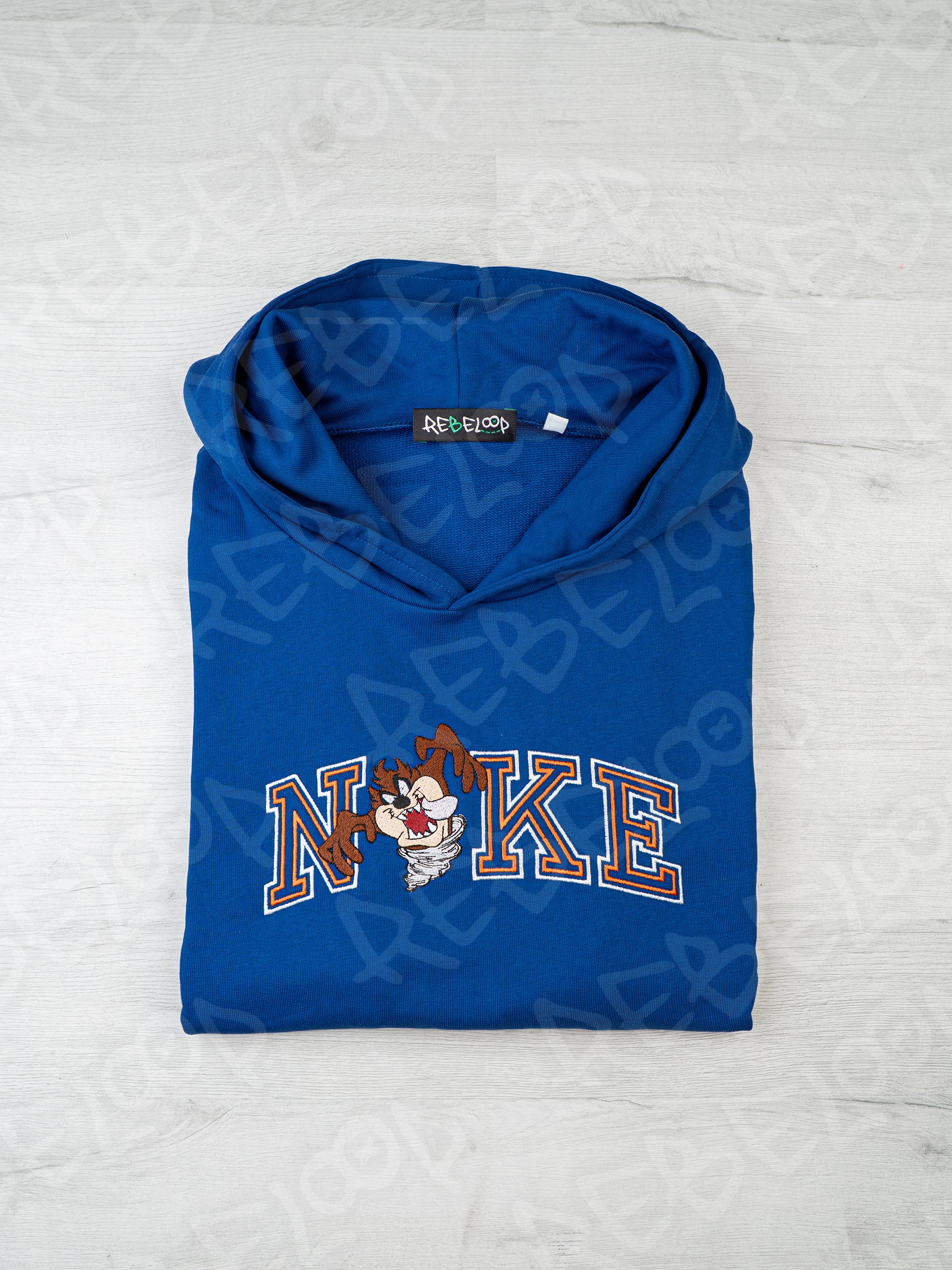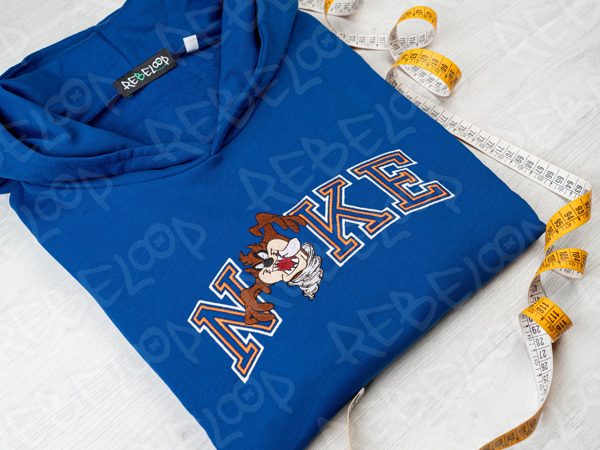 Felpa con ricamo ispirato a Taz, scritta realizzata con un punto cordoncino.