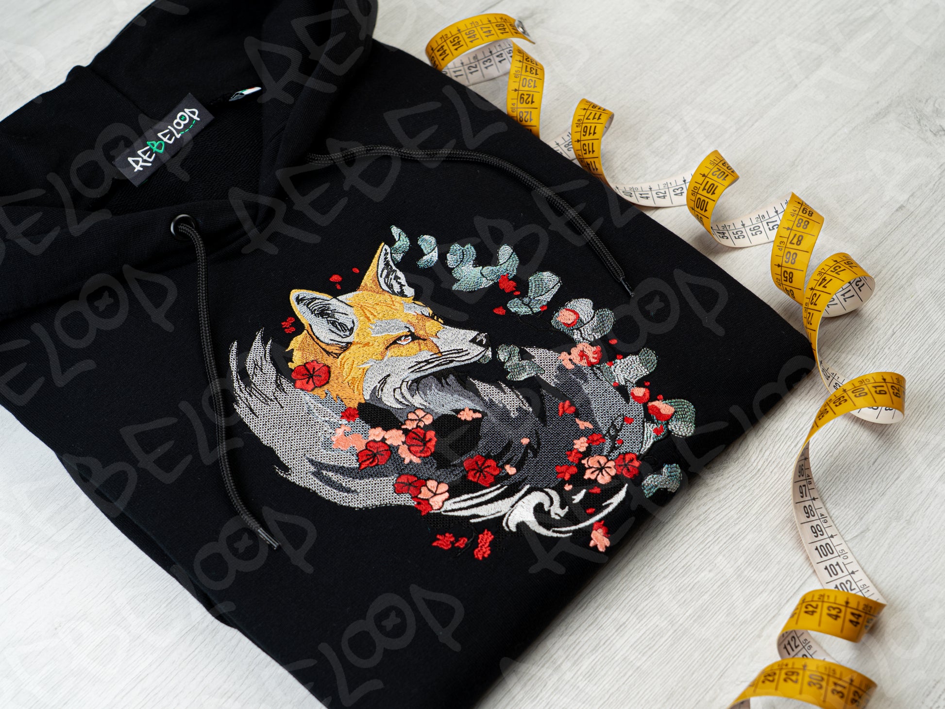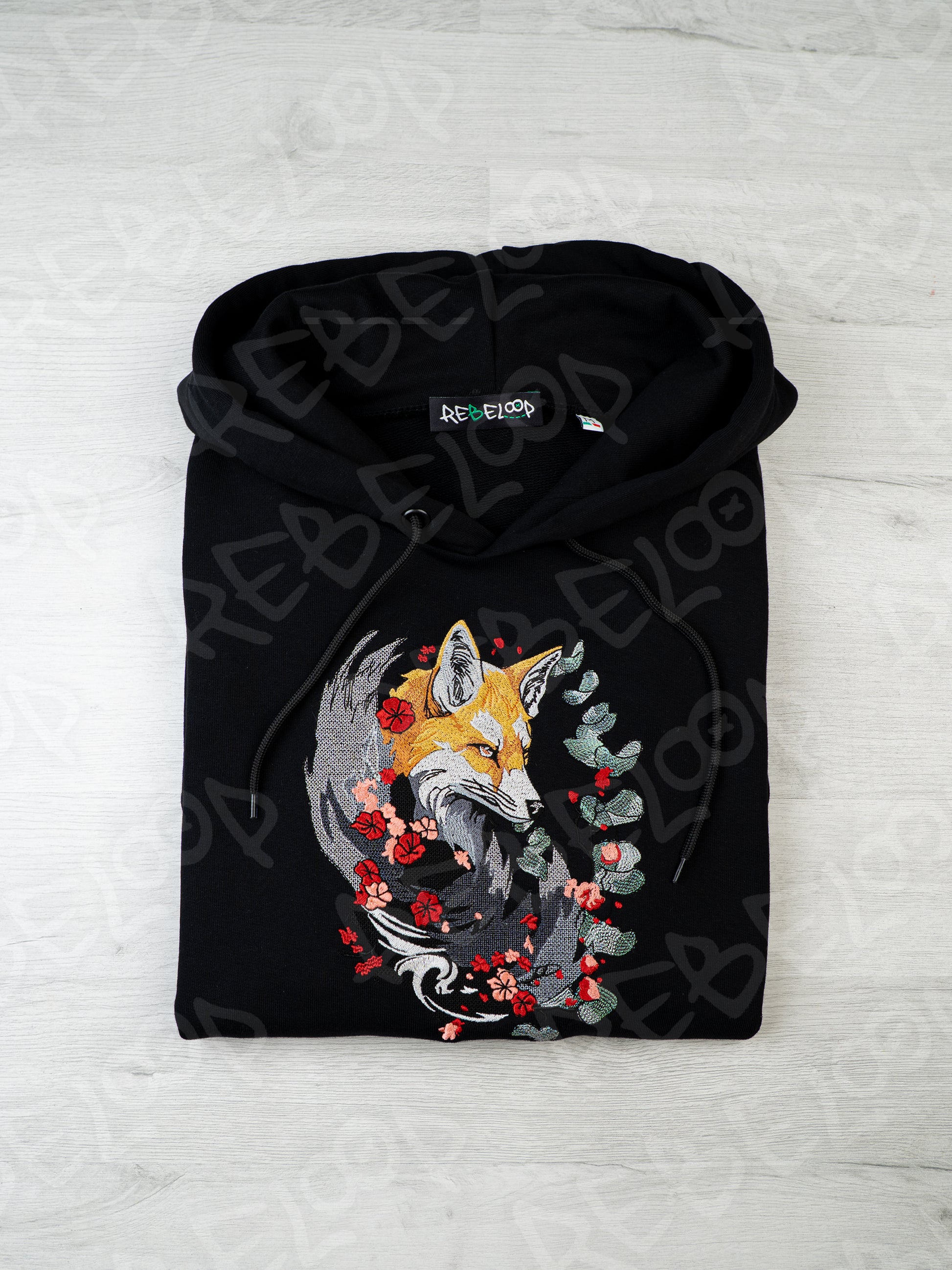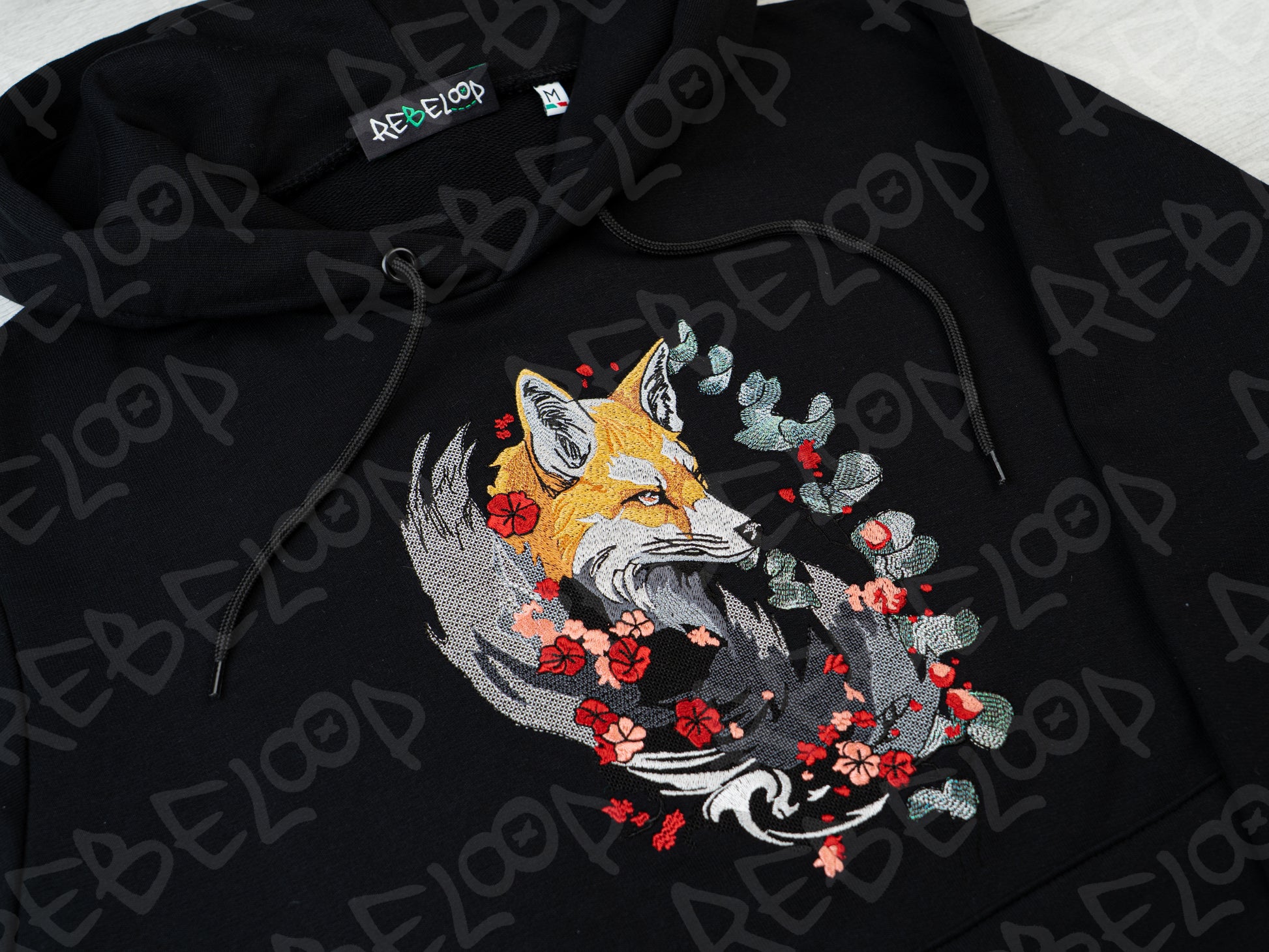 Felpa con ricamata una volpe giapponese in stile realistico. I petali sono realizzati con un filato olograf per dare un effetto luce al ricamo.