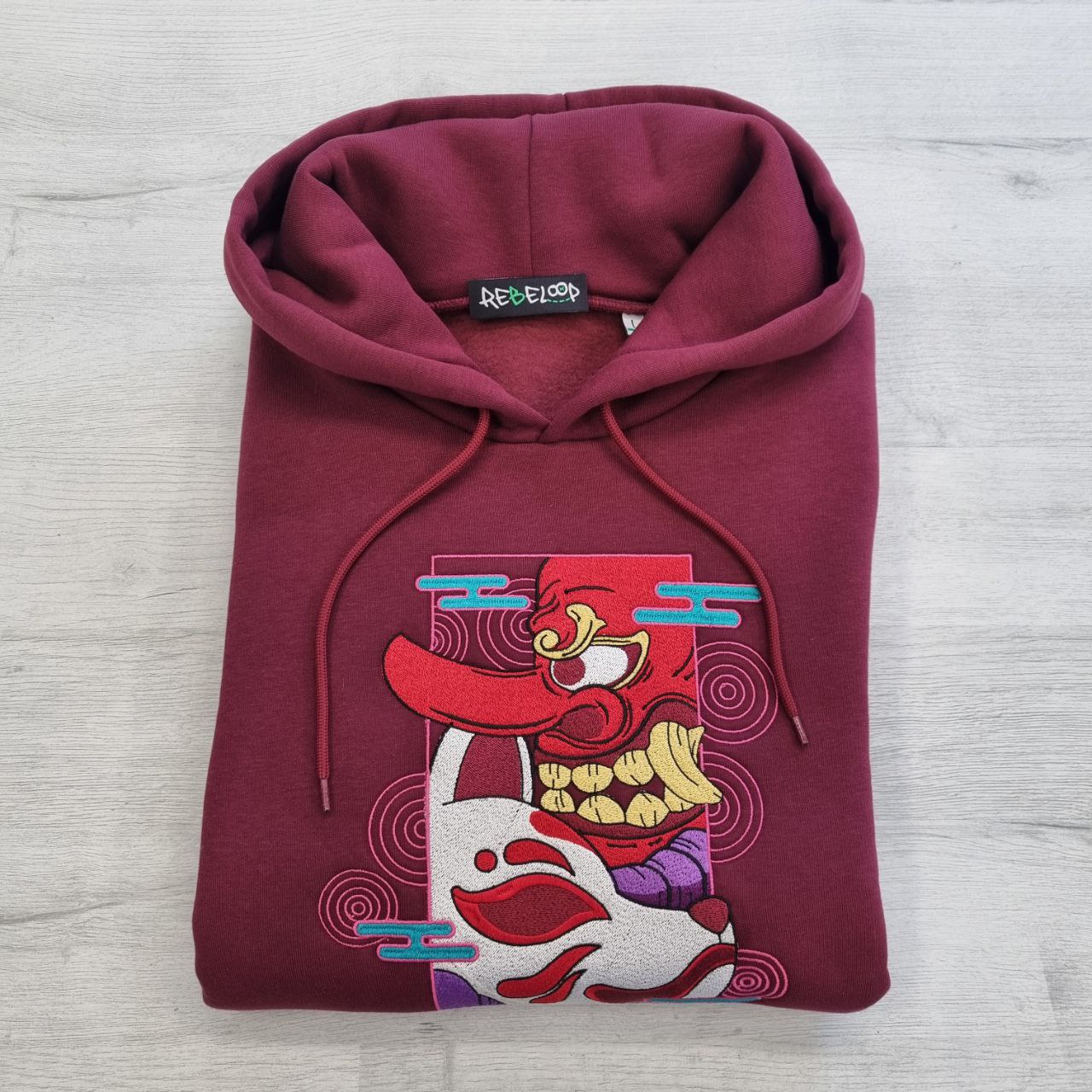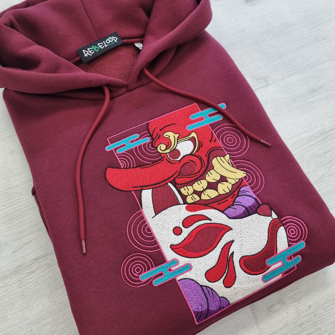 Felpa con ricamate due maschere della tradizione giapponese, una Kitsune e un Tegu.