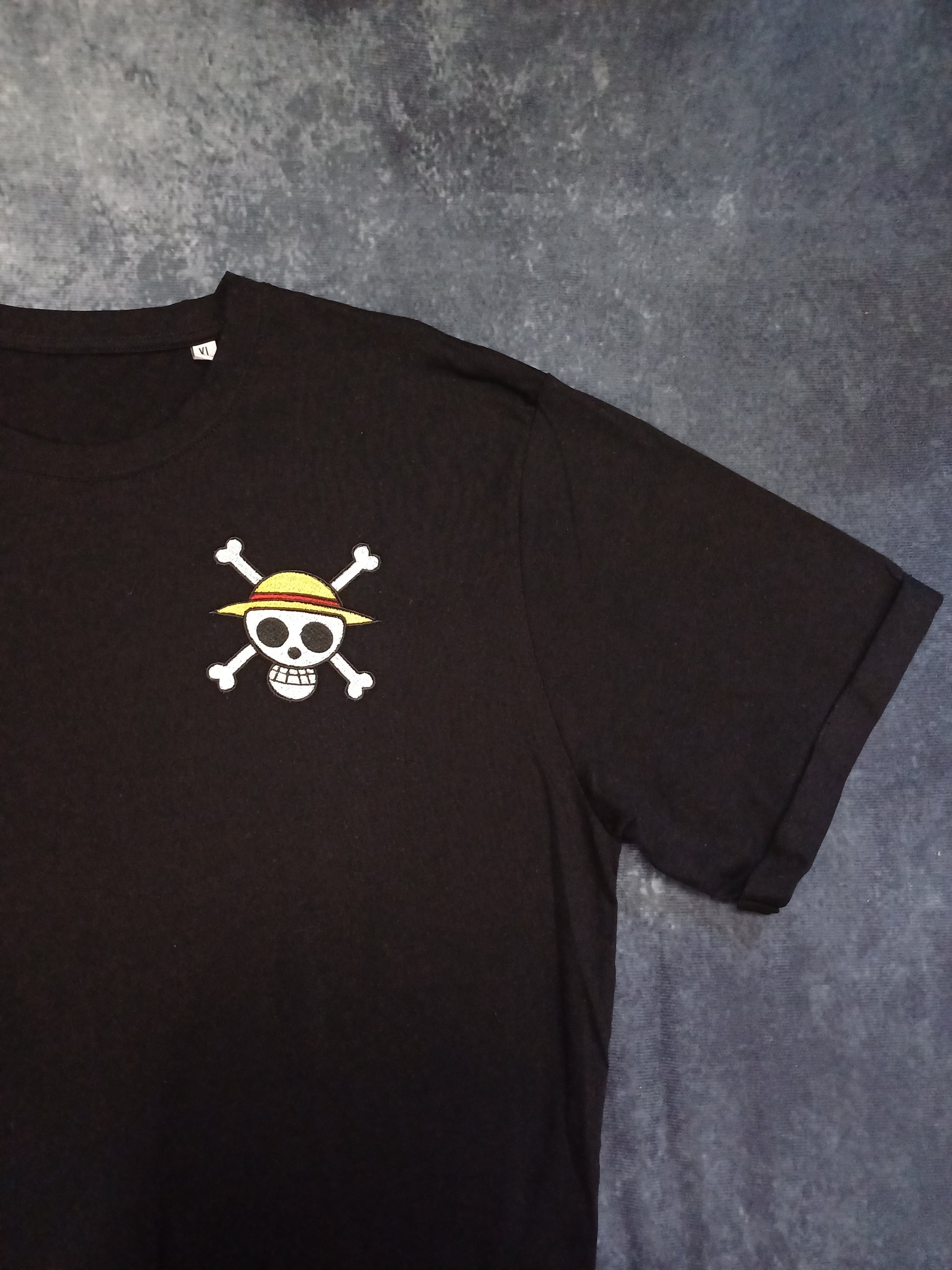 T-shirt con ricamo ispirato al teschio di Luffy della serie One Piece.
